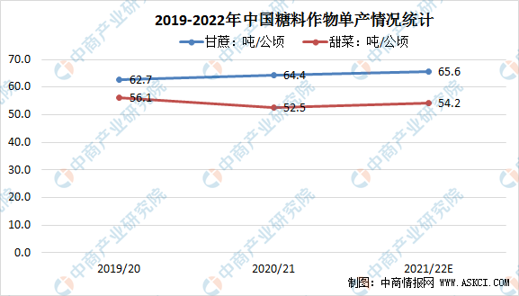 目前,我国糖料作物中,甘蔗的种植面积远高于甜菜,甘蔗的单产亦大于甜菜,2021/22年中国甘蔗单产为65.6吨/公顷,甜菜为54.2吨/公顷。