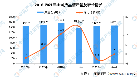 近年来,在国内市场强劲需求的推动下,我国成品糖产业整体保持平稳发展,受到我国糖料作物种植面积波动的影响,我国成品糖产量波动较为明显,2019年我国成品糖的累计产量为1356.52万吨,2021年全国成品糖产量为1457.1万吨。随着成品糖产业投入加大,行业技术突破与规模积累,未来发展不断加速。