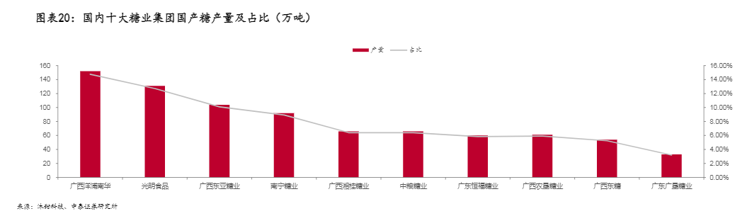 目前,国内十大糖业集团国产糖产量占全国产量的80%。广西洋浦南华、光明食品是国内最大两家的糖业集团,占比国内产量的25%,两家上市糖企南宁糖业和中粮糖业在国内产糖量排名分别为第4、6位;东亚糖业、博天糖业属外商控股。