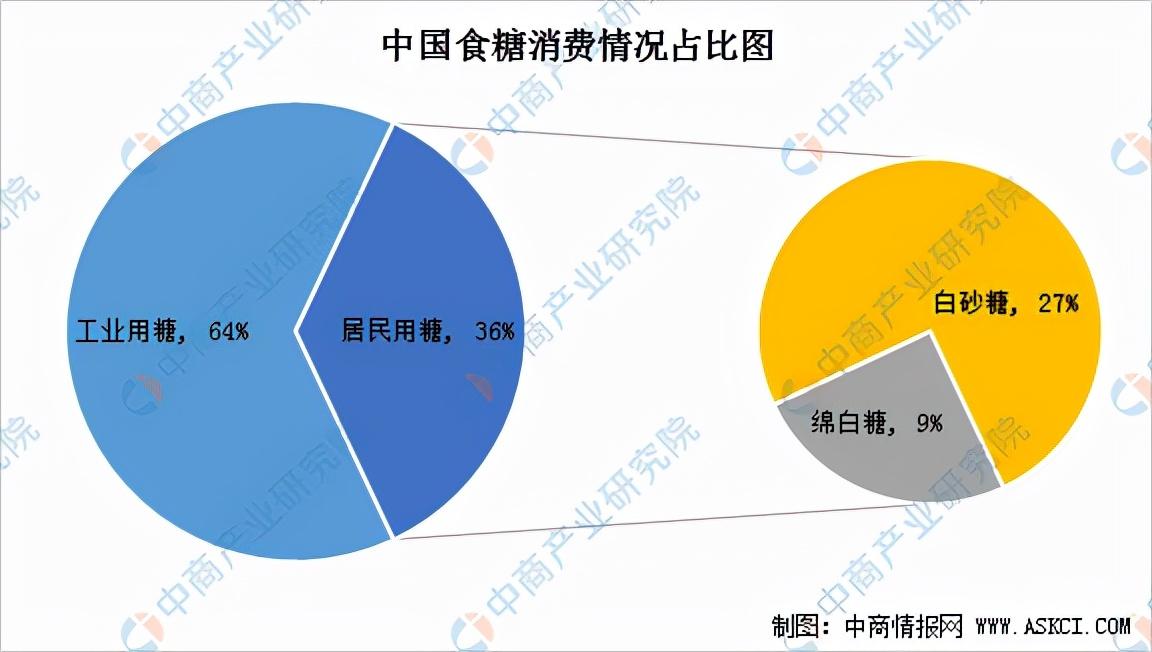 用于食品加工等行业的食糖工业消费占比为64%;用于居民和餐饮行业直接食用等领域的食糖民用消费占比为36%,其中白砂糖用量占比为27%,绵白糖用量占比为9%。
