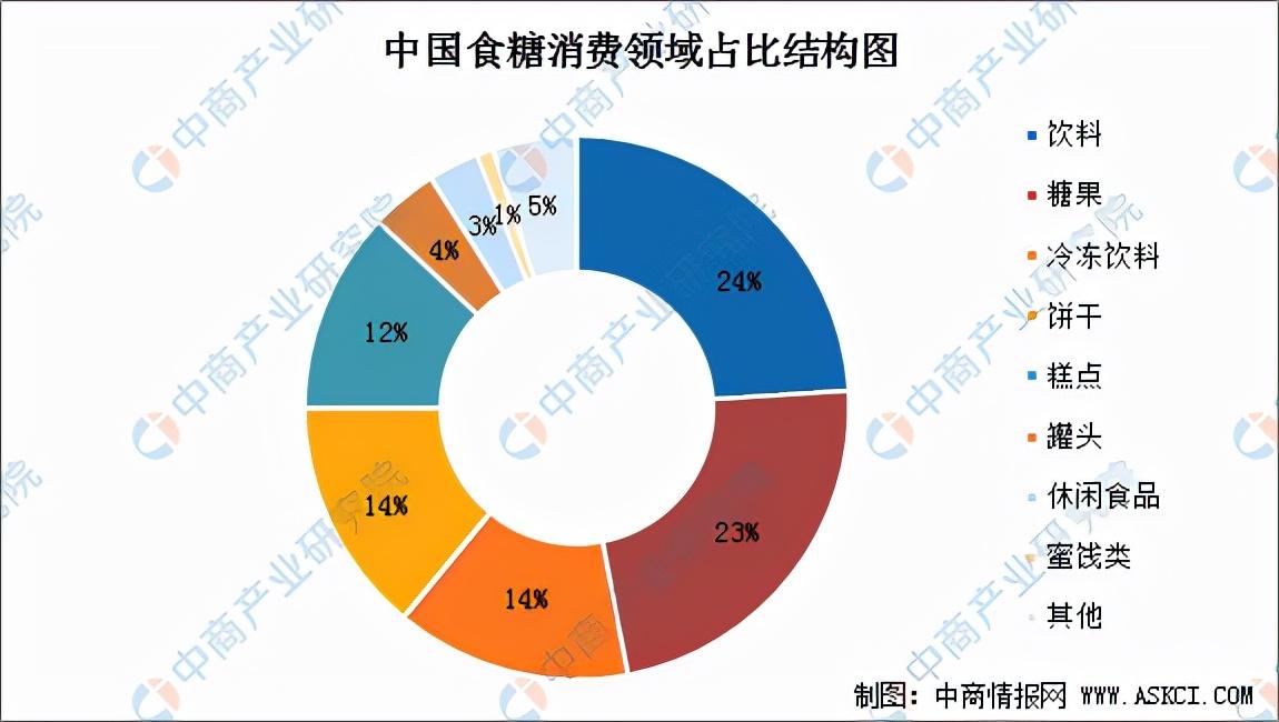 目前我国食糖年人均食糖消费量(包括各种加工食品用糖)达到11.5公斤。我国食品工业、饮料业、饮食业等用糖行业的快速发展,推动了我国食糖工业消费的稳步上升。食糖消费结构发生了变化,食品业发展有效促进食糖消费的增长。主要包括糖果、糕点、罐头、果汁及果汁饮料。