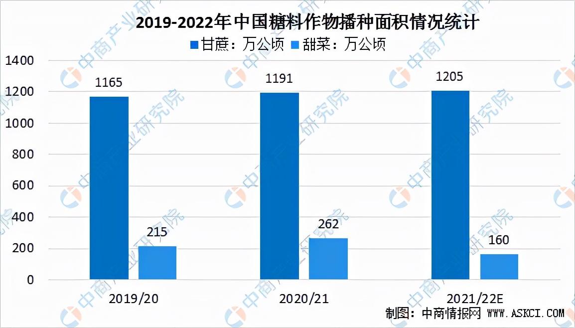 我国是重要的食糖生产国和消费国,糖料种植在我国农业经济中占有重要地位,其产量和产值仅次于粮食、油料、棉花,居第四位。我国是世界上用甘蔗制糖最早的国家之一,已有2000多年的历史,用甜菜制糖是近几十年才开始的。甘蔗具有宿根性,即一年种植,三年收获,当年糖产量可以追溯1-3年前的甘蔗播种面积。预计2021/22年中国甘蔗播种面积为1205万公顷,甜菜为160万公顷。