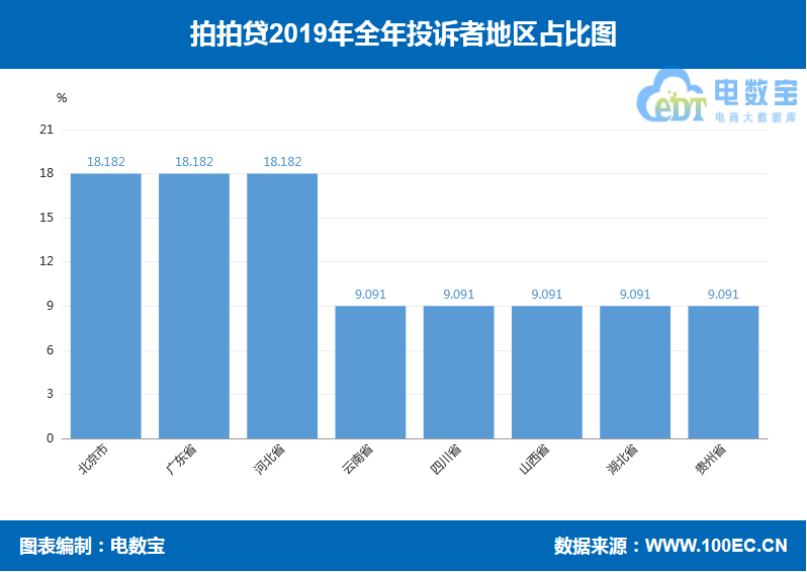 据“电数宝”显示,2019年度投诉“拍拍贷”的用户主要集中地为北京市、广东省、河北省、云南省、四川省、山西省、湖北省、贵州省。