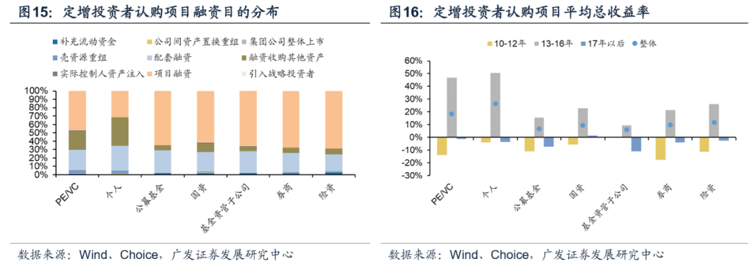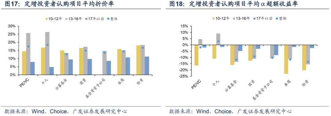 ①基金、券商偏好热度较高项目,折价率较低,收益率和胜率也较难跑赢市场整体,建议精选项目;②险资和国资参与定增相对谨慎,但常认购较大规模项目且收益平稳较优;③个人投资者较依赖择时,在13-16年收益显著。