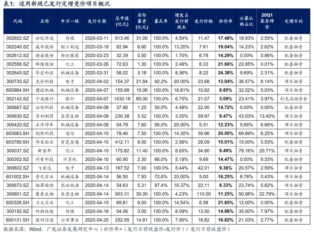 2.14再融资新规以来,目前有已公告按新规发行竞价项目22例(4月中旬以来发行加速),发行概况如下:①行业分布上,机械设备最多(5例);②发行规模上,募资总额279.09亿元,平均募资额12.69亿元,其中4例募资规模超过20亿(世纪华通、宁波银行、光弘科技、康泰生物),增发占发行前股本比例平均9.50%,足额募资项目占比72.7%;③定增目的上,配套融资11例,项目融资10例,补流1例。