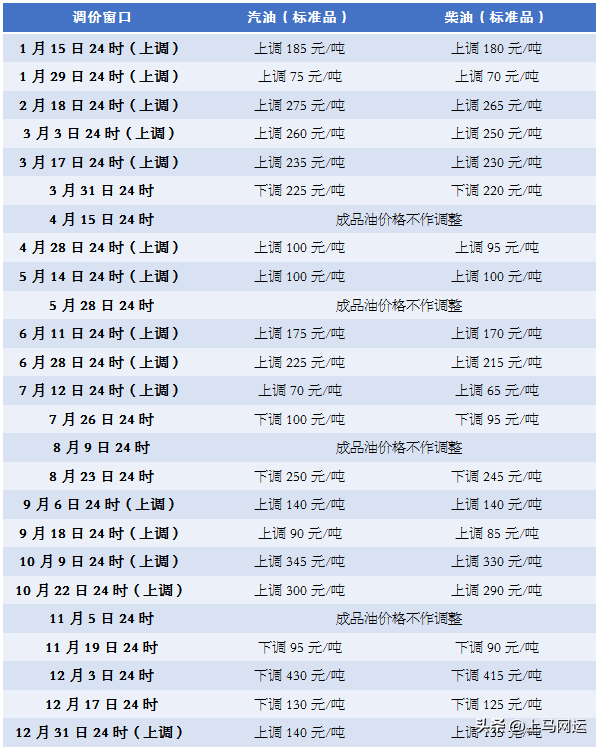 2021年,根据现行成品油零售价调价规则,国内成品油共经历了25轮调价窗口期,全年成品油调价呈现出“15涨6跌4搁浅”的格局,跌涨互抵后,年内标准汽油和柴油价格每吨分别累计上调1485元和1430元,折合92号汽油每升累计上涨1.17元,95号汽油每升累计上涨1.23元,0号柴油每升累计上涨1.22元。