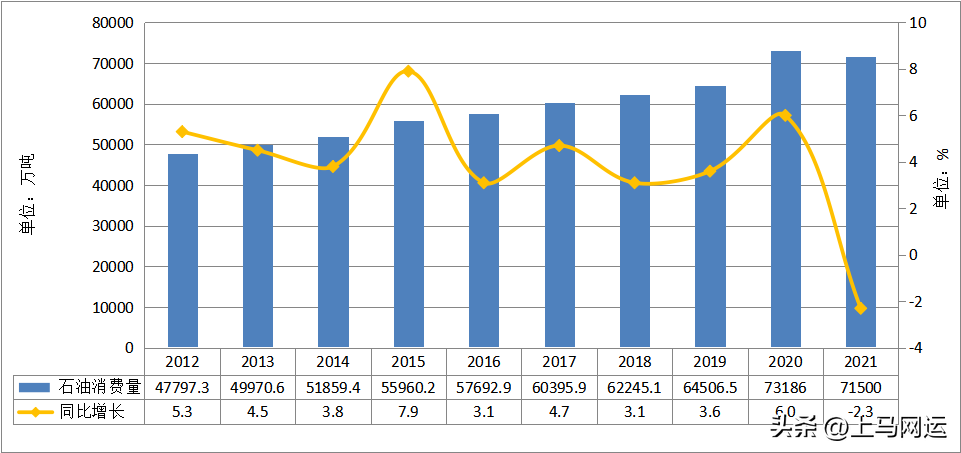 根据中石油经济技术研究院的统计数据,2021年,我国石油表观消费量约7.15亿吨、同比下降2.3%,这是多年以来我国石油表观消费量首次出现回落。2021年我国石油需求随疫情反复而持续震荡,二季度以来受2020年高基数影响原油进口量同比大幅回落,导致我国石油表观消费量持续负增长。