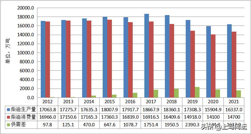 ,2021年,工业、建筑、交通等高耗能产业持续加快转型升级,对柴油消费起到明显的支撑作用,以房地产为代表的主要用油行业受政策调控影响较大,进一步加快柴油消费的恢复。全年柴油产量为16337万吨、同比增长2.7%,柴油表观消费量为14700万吨、同比增长4.3%,柴油供需差较2020年减少约168万吨。