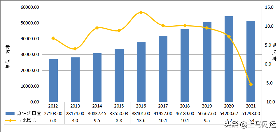 海关总署数据显示,2021年,我国进口原油51298万吨、同比下降5.4%,这是多年以来我国原油进口量首次出现回落。原油进口量下降的原因是多方面的:一方面,2020年我国原油进口量刷新历史纪录,国内资源充裕,库存与港口压力显现;另一方面,2021年以来国际油价上涨,进口原油的成本大幅走高,抑制了部分进口需求。2021年,我国石油对外依存度首次下降,降至72%左右。