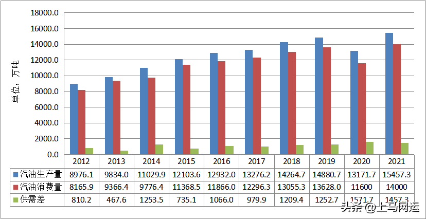 ,2021年,国内乘用车销售市场向好,居民出行意愿持续释放。全年汽油产量为15457.3万吨、同比增长17.4%,表观消费量为14000万吨、同比增长20.7%,汽油供需差较2020年减少约114万吨。