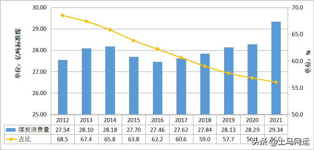 据国家统计局初步核算,2021年全年能源消费总量52.4亿吨标准煤,比上年增长5.2%。煤炭消费量增长4.6%,煤炭消费量占能源消费总量的56%,比上年下降0.9个百分点。过去十年,煤炭消费量占一次能源消费比重下降了12.5个百分点,尽管该比例持续走低但仍占据半壁江山。