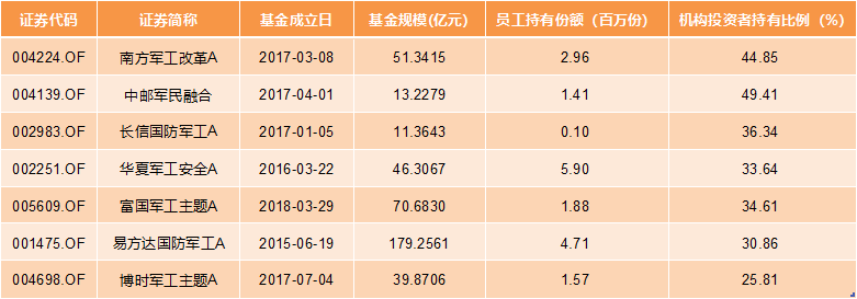 从机构的持仓比例来看,也是相对较高的,达到了44%,比易方达国防军工和富国军工的要高,说明还是得到了机构的认可,而且内部的员工持有份额达到了296万份。