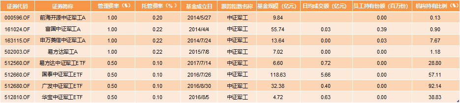 规模最大的是国泰中证军工ETF,达到了118亿元,其场内的流动性也是最大的,日均成交在5.6亿元,费率也相对比较便宜,托管费和管理费为0.6%。