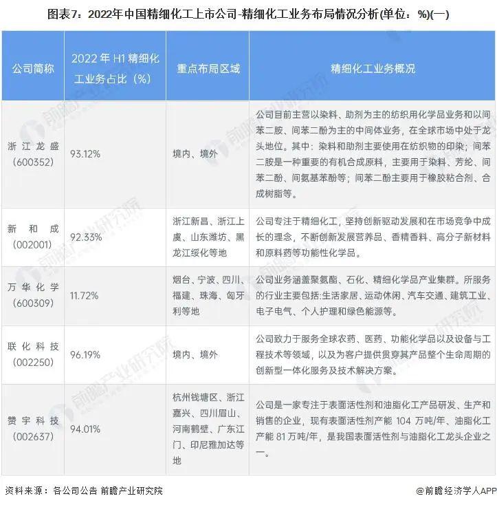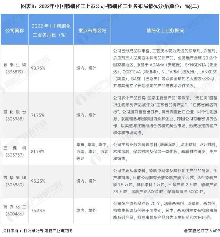 从业务布局来看,选取的代表上市企业精细化工业务在涂 ( 染 ) 料、农药、医药、食品行业有所布局。企业的精细化工业务布局情况主要取决于企业所在的行业。从各企业精细化工业务布局的重点区域来看,大部分企业的布局重点均位于境内,部分企业在海外地区也有所布局。