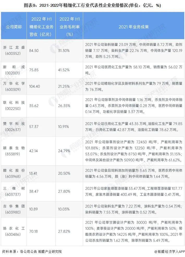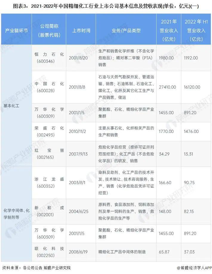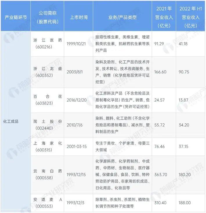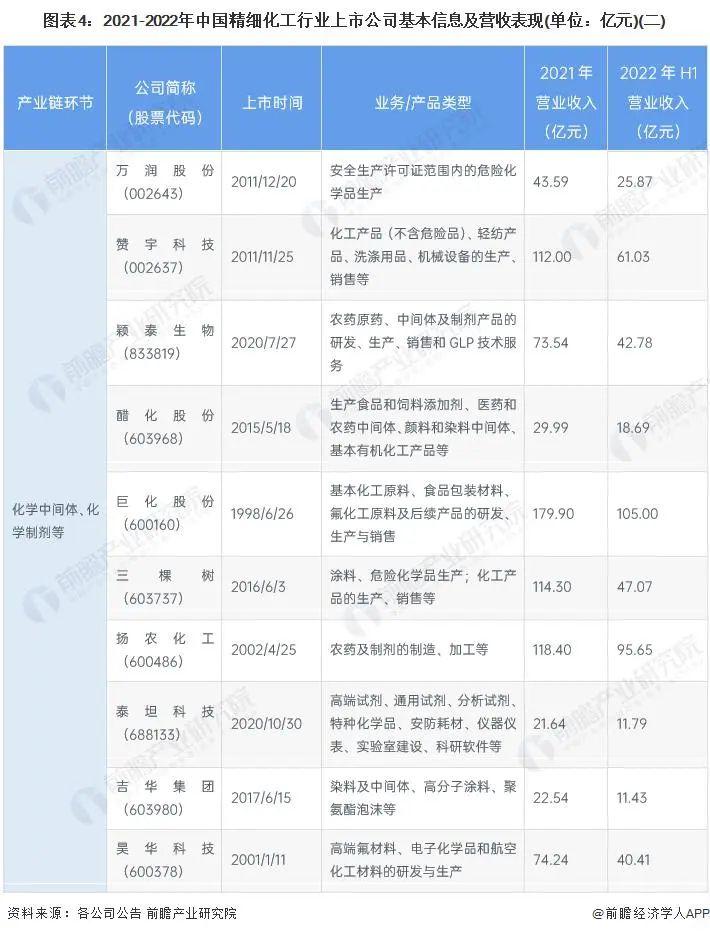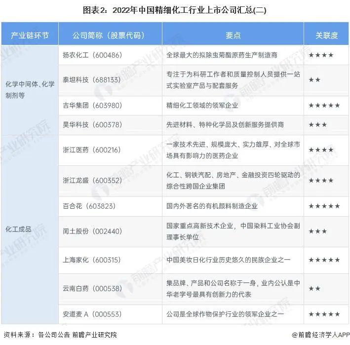 精细化工行业包括精细化学品与专用化学品,与通用及半通用化学品均为大宗产品不同,精细化工产品具有少量生产、目前应用领域相对较为集中、产业链长而复杂的特点,通过对基本化工原料进行一系列的化学反应制备而成,产品主要应用在医药、农药、染料、液晶等领域。精细化工全产业链主要包括基础化工、化学中间体和化工制剂和化工成品。我国精细化工涉及较多行业领域,上市企业数量较多,根据不同环节选取了部分代表企业进行分析,具体内容如下: