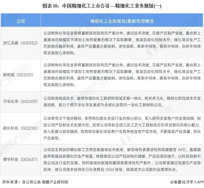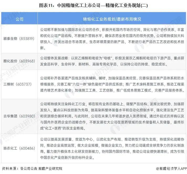根据 " 十四五 " 化工行业发展规划,未来可以从两大方面入手促进精细化工行业健康发展。其一,继续推进产能整合,淘汰落后产能 ; 其二,通过清洁生产、绿色发展以及技术创新来实现产业价值链提升。同时," 双碳 " 战略通过带有约束条件的发展,不断优化行业结构,提升行业技术水平,促进经济朝更高质量和更可持续的方向发展。企业依托行业整体的发展方向制定了各自的发展规划: