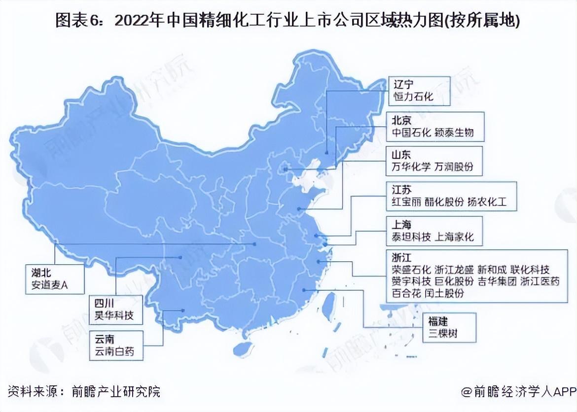 从区域分布来看,目前我国精细化工行业上市公司主要分布在华东沿海地区,其中选取的代表企业中,大部分分布在浙江地区,代表企业有浙江龙盛等。
