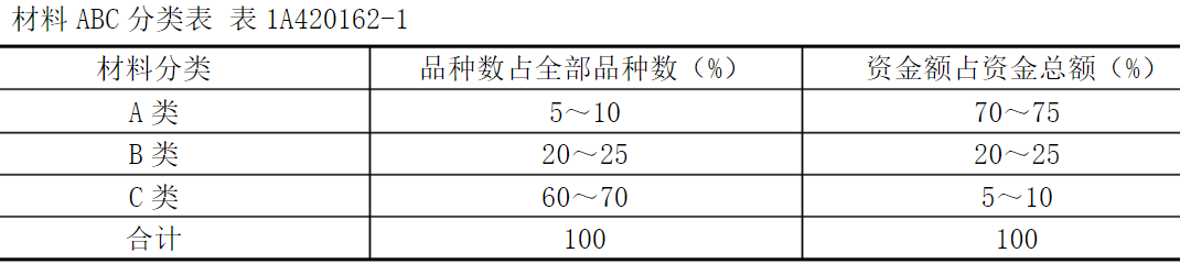 根据库存材料的占用资金大小和品种数量之间的关系,把材料分为 ABC 三类(见表1A420162-1),找出重点管理材料的一种方法。