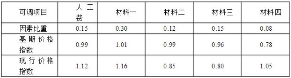 事件:合同中约定,根据人工费和四项主要材料的价格指数对总造价按调值公式法进行调整。各调值因素的比重、基准和现行价格指数如下表: