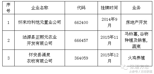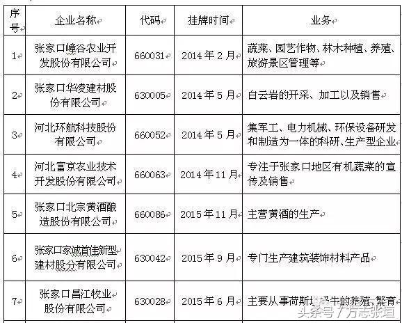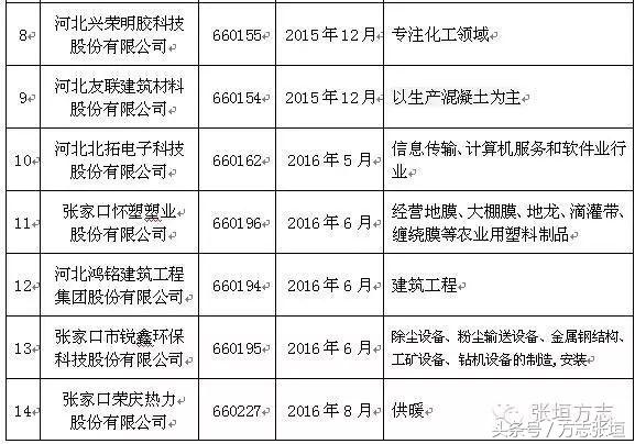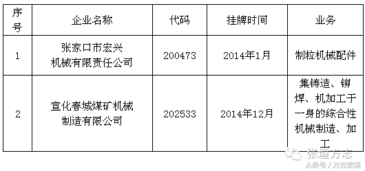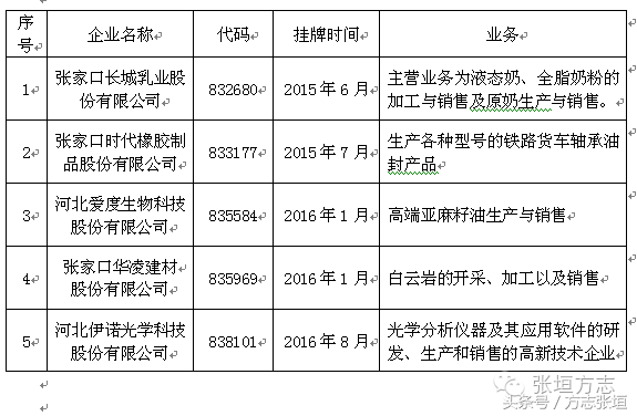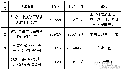 围绕省政府出台的《关于加快金融改革发展的实施意见》和《关于建立健全地方金融监督管理体制的实施意见》,张家口市确定了建立健全地方金融监管体制、加快金融市场主体建设、提升多层次资本市场融资能力等发展思路,稳步推进直接融资、创新信贷方式等多种形式的社会融资,截至2016年10月,全市共有挂牌上市公司35家,其中深圳证券交易所(深交所)主板1家、香港交易及结算所(港交所)创业板1家、全国中小企业股份转让系统(新三板)5家,天津股权交易所(天交所)4家、石家庄股权交易所(石交所)19家、深圳前海股权交易所3家,上海股权交易托管中心2家。今天张垣方志向大家简单介绍张家口市的挂牌上市企业。