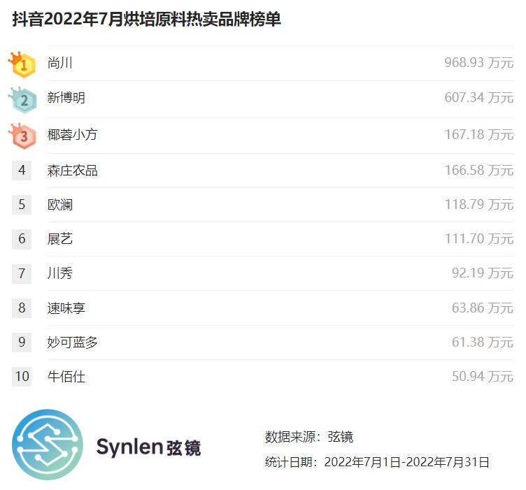 根据电商数据搜索工具——“弦镜”数据显示,抖音平台2022年7月烘焙原料热卖品牌榜单,第一名尚川,销售额为968.93万元。第二名新博明,销售额为607.34万元。第三名椰蓉小方,销售额为167.18万元。从第四名到第十名分别为森庄农品、欧澜、展艺、川秀、速味享、妙可蓝多、牛佰仕。
