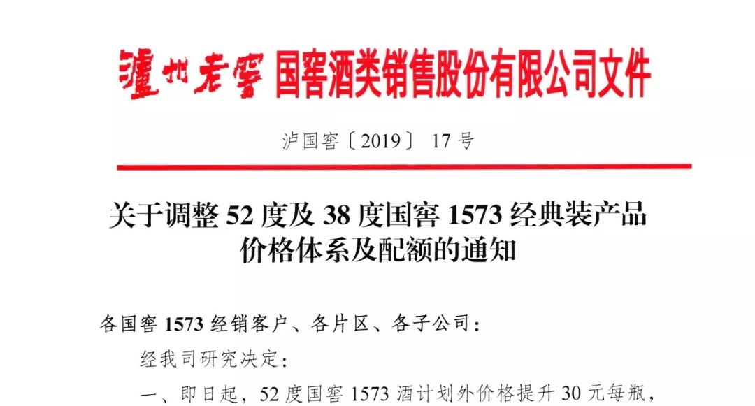 刚刚(8月2日上午),泸州老窖国窖酒类销售股份有限公司发布《关于52度及38度国窖1573经典装产品价格体系及配额的通知》,其主要内容如下: