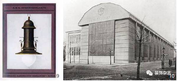 彼得·贝伦斯在柏林为德国通用电气公司( AEG )所做的工作的确可算作历史上第一次「合作设计」。[10] 从 1907 年到 1914 年,贝伦斯成为该公司的「艺术顾问」,并开设了自己的工作室。他与众多同事(包括瓦尔特·格罗皮乌斯、路德维希·密斯·凡·德·罗和勒·柯布西耶等)一起,为公司设计从信笺到工业建筑的全部视觉形象和几乎所有产品。(图 8、9 )这其中,一方是彼得·贝伦斯,另一方是德国通用电气公司的创始人埃米尔·拉特瑙与经理主管保罗·乔丹,双方共同展现了一种完美的「设计师- 雇主」合作局面。类似的这种合作,还能在之后的迪特·拉姆斯与布劳恩兄弟,以及 21 世纪在苹果公司内的乔纳森·伊夫与史蒂夫·乔布斯之间找到延续。在一战之前的德国,这种设计合作涉及的不仅是一种崭新的产品文化,更是一种崭新的普遍文化,正如弗里德里希·尼采 30 年前在他的《不合时宜的考察》一书中要求的[11],且在当今发达高科技背景下被证明可行的那样。