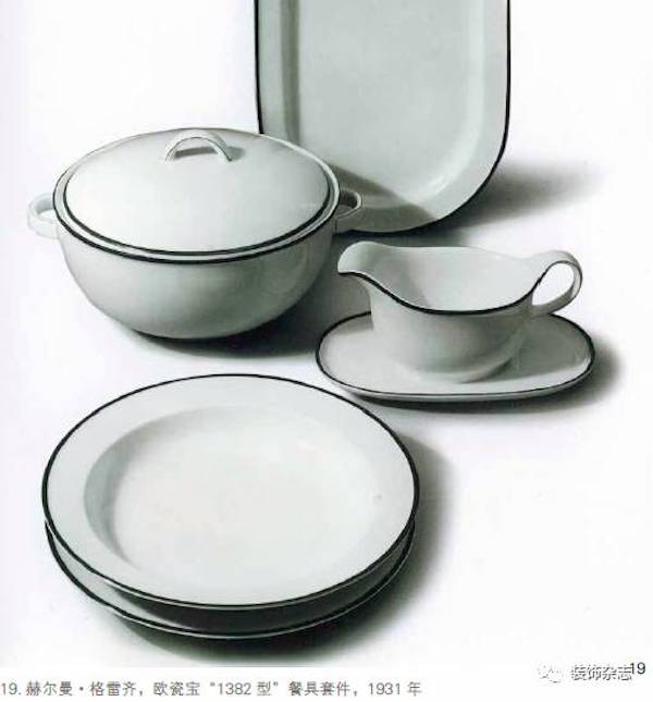 「新法兰克福」、包豪斯以及其他先进地区的「白色现代主义」,皆因其社会主义或社会民主主义的思想而被国家社会主义分子所排斥。后者在文化上仍遵循以农业为本的 19 世纪的理念,不知如何应对这些白色的立方体。现代主义中那些较为中性的、不与法西斯意识形态相悖的部分,则被其利用。尤其在技术领域,所有现代主义都受到国家社会主义的高度欢迎。比如费迪南德·波舍尔设计的「大众汽车」,或是瓦尔特·马里亚·克斯廷 1928 年设计的「人民收音机」。在国家的补贴下,这款收音机到 1939 年已经生产了超过 120 万台。包豪斯和制造同盟于 1933 年被迫解散,其大量的设计积累被新的当权者接手,如包豪斯大师们和法兰克福艺术学校教师克里斯蒂安·戴尔设计的众多灯具,赫尔曼·格雷齐 1931 年为欧瓷宝公司设计的高度简洁的「 1382 」餐具。(图19)然而,我们并不能因此就说现代主义设计在纳粹德国时期有多么长远的发展,只能说万马齐喑、重病缠身的现代主义有一些形式的残余,因为其进一步发展的基础和前提已经不再。