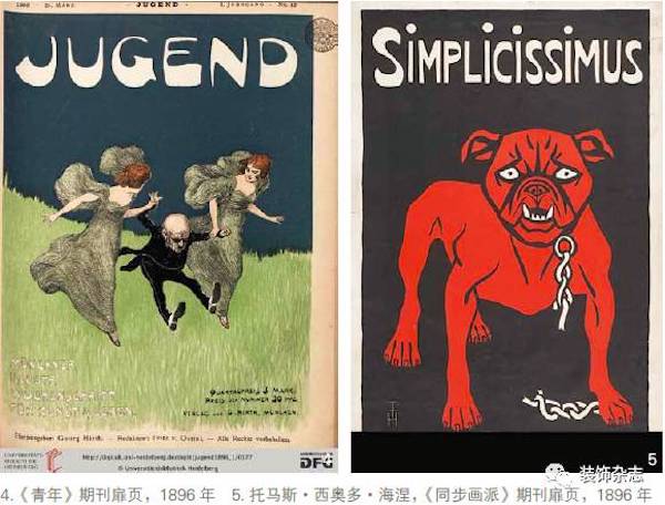 德国的版画青年风格最早在海报中的运用较少,而是以更显著的方式出现在一些相继创立的期刊上。例如令该运动得名的《青年》( 1896 年,图 4 ),还有《潘》( 1895 年)、《同步画派》( 1896 年)、《神圣春天》(维也纳,1898 年)和《岛》( 1899 年)。托马斯·西奥多·海涅是《同步画派》期刊的合伙创办人兼主编。由他设计的一个挣脱锁链的牛头犬图案,不仅成为该期刊的象征,还成为 1900 年代新德国版画的代表。(图 5 )