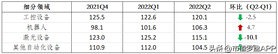4.自动化设备上市公司运营能力指数稳定,2022年二季度有提升,环比升高5.3,较A股仍有差距。从细分领域来看,工控设备领域上市公司群体运营能力较A股有明显优势,其他领域均低于A股表现;工控设备、其他自动化设备领域运营能力有明显改善,机器人、激光设备领域没有明显变化。
