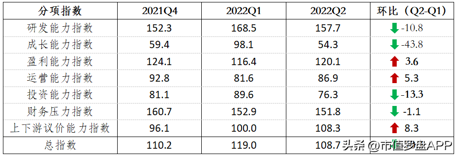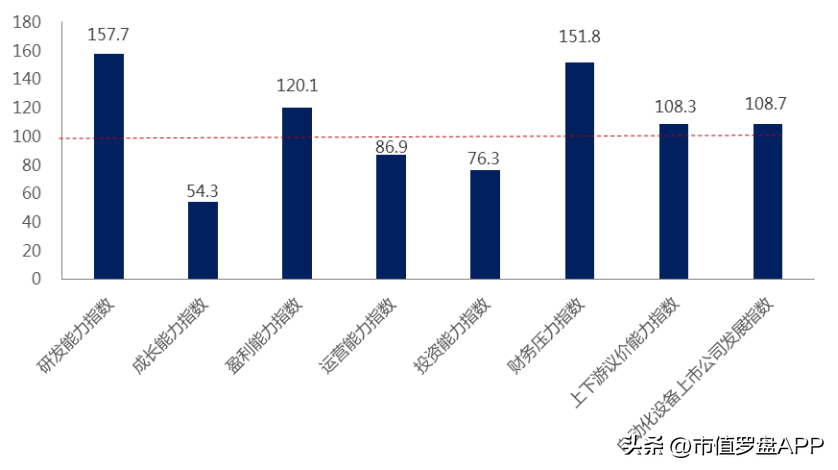 1.研发能力指数、盈利能力指数、财务压力指数、上下游议价能力指数高于临界值100,其中研发能力指数、财务压力指数高出临界值最多,其次是盈利能力指数;
