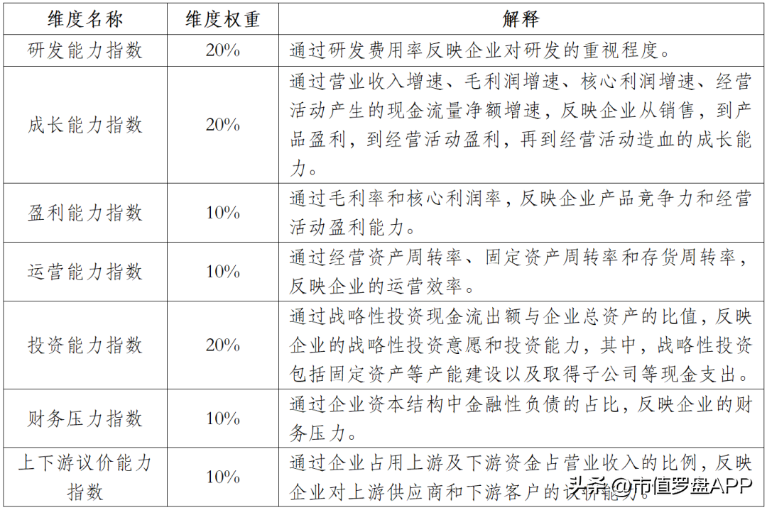 监测维度:自动化设备上市公司发展指数具体包括七大维度:研发能力、成长能力、盈利能力、运营能力、投资能力、财务压力和上下游议价能力,根据不同维度的重要程度赋予不同权重。