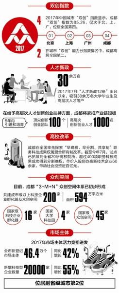 数据更能说明——2017年中国城市“双创”指数显示,成都“双创”指数为85.26,仅次于北京、上海、广州,位居全国第四。在城市“双创”能力分指数排名中,成都高居全国第二。成都还被《财富》杂志评为“中国十大创业城市”。记者梳理出更多数据,来解读成都双创的吸引力。