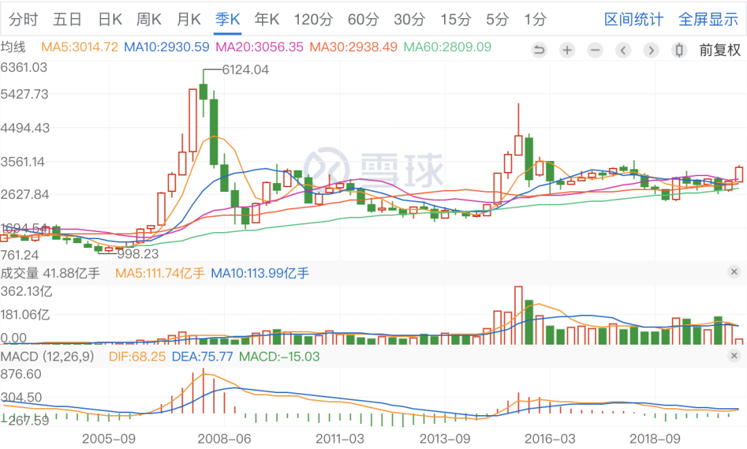 下面这张图是上证指数从 2004 年到 2020 年的季线图。可以清楚地看到,这期间有两次比较大的牛市,一次是 2006 ~ 2007 年,一次是 2014 ~ 2015 年。