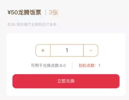 花1点权益可以兑换50元的龙腾饭票3张(10个点可以兑换到价值1500元的龙腾饭票),工行真是大方!下次在机场/高铁可以直接买实物礼品、吃饭啦!