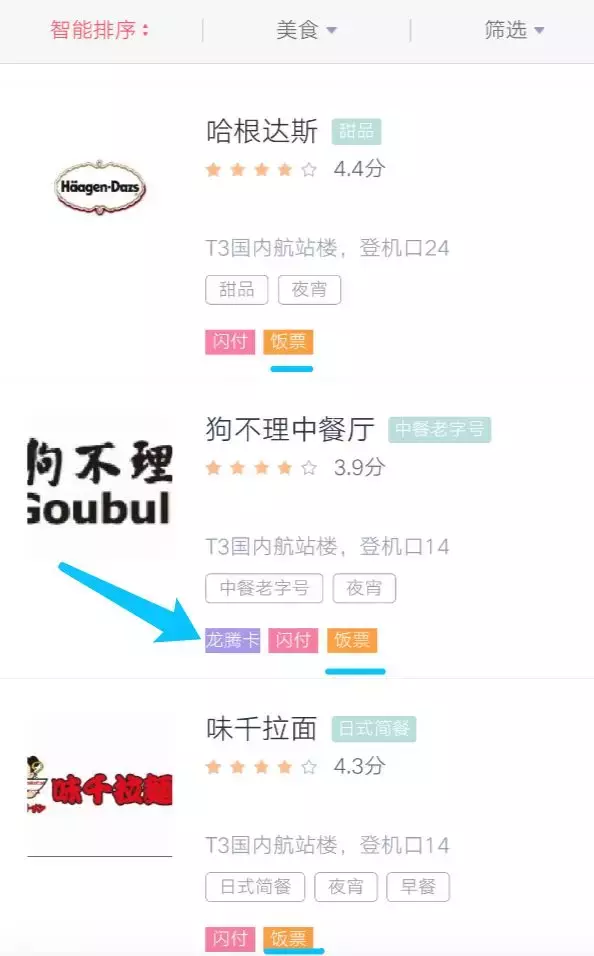 看下图的蓝色划线和箭头。很明显的,这些美食餐厅,大都是支持【饭票】也就是用1点权益兑换的3张50元龙腾饭票,看到打着饭票标签的餐厅,
