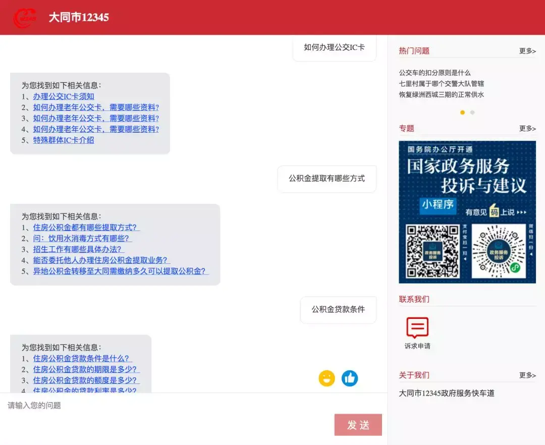 平台利用自然语言处理技术,将智能客服、人工服务、知识数据资源联接在一起,为市民提供全天候政务咨询服务,相较于传统的人工方式,智能咨询平台可以大规模、个性化地实现信息实时反馈,真正做到政务智能化、便民一体化。