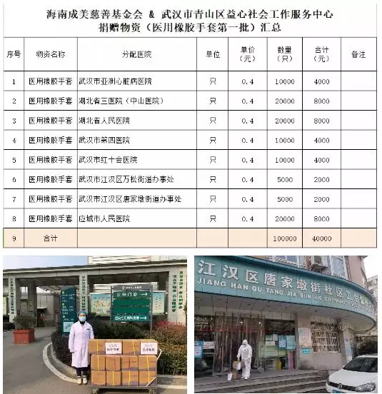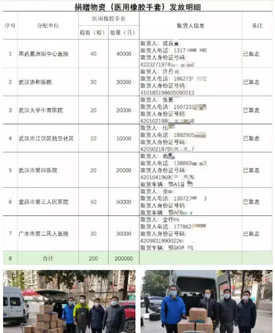 ,武汉协和医院、国药葛洲坝中心医院、宜昌市第三人民医院等7家机构签收:20万只医疗橡胶手套。