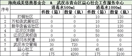 ,新华街省运社区、武汉市交管局、打铜社区等8家机构签收:4200瓶500ml装消毒水、2100瓶1000ml装消毒水。