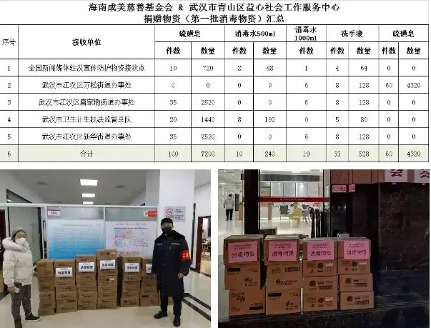 ,武汉市卫生计生执法监督总队、武汉市江汉区万松街道办事处、全国新闻媒体驻汉宣传防护物资接收点在内的5家机构陆续签收:11520个硫磺皂、240瓶500ml装消毒水、228瓶1000ml装消毒水、528瓶洗手液。