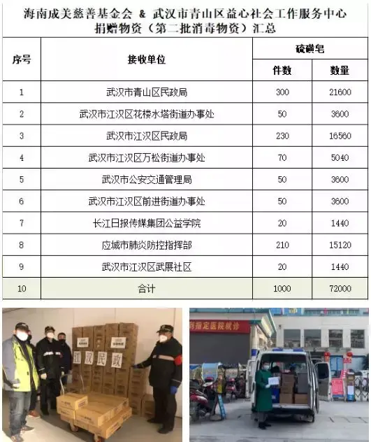 ,武汉市江汉区花楼水塔街道办事处、应城市肺炎防控指挥部、武汉市江汉区前进街道办事处等9家机构签收:72000个硫磺皂。